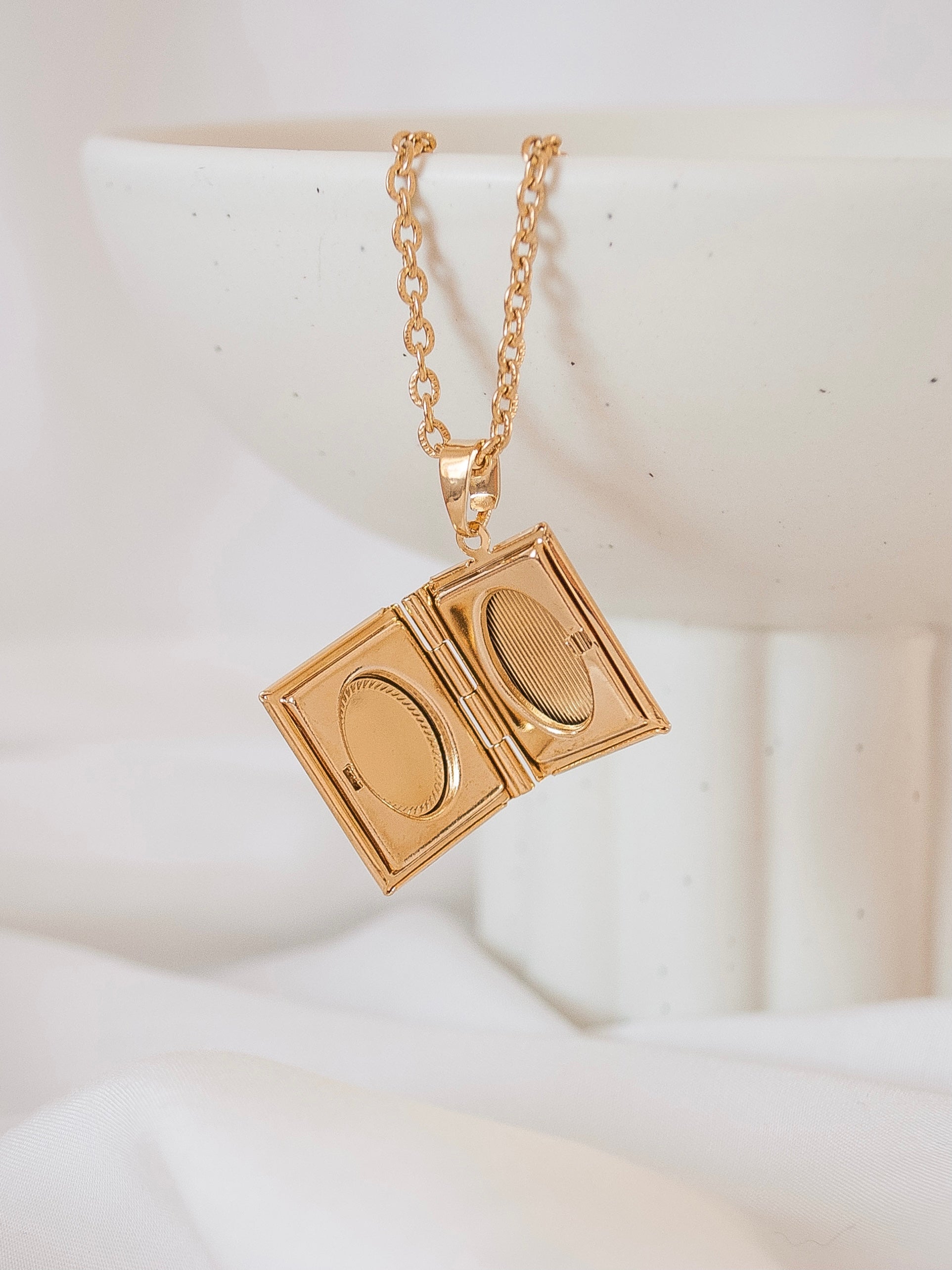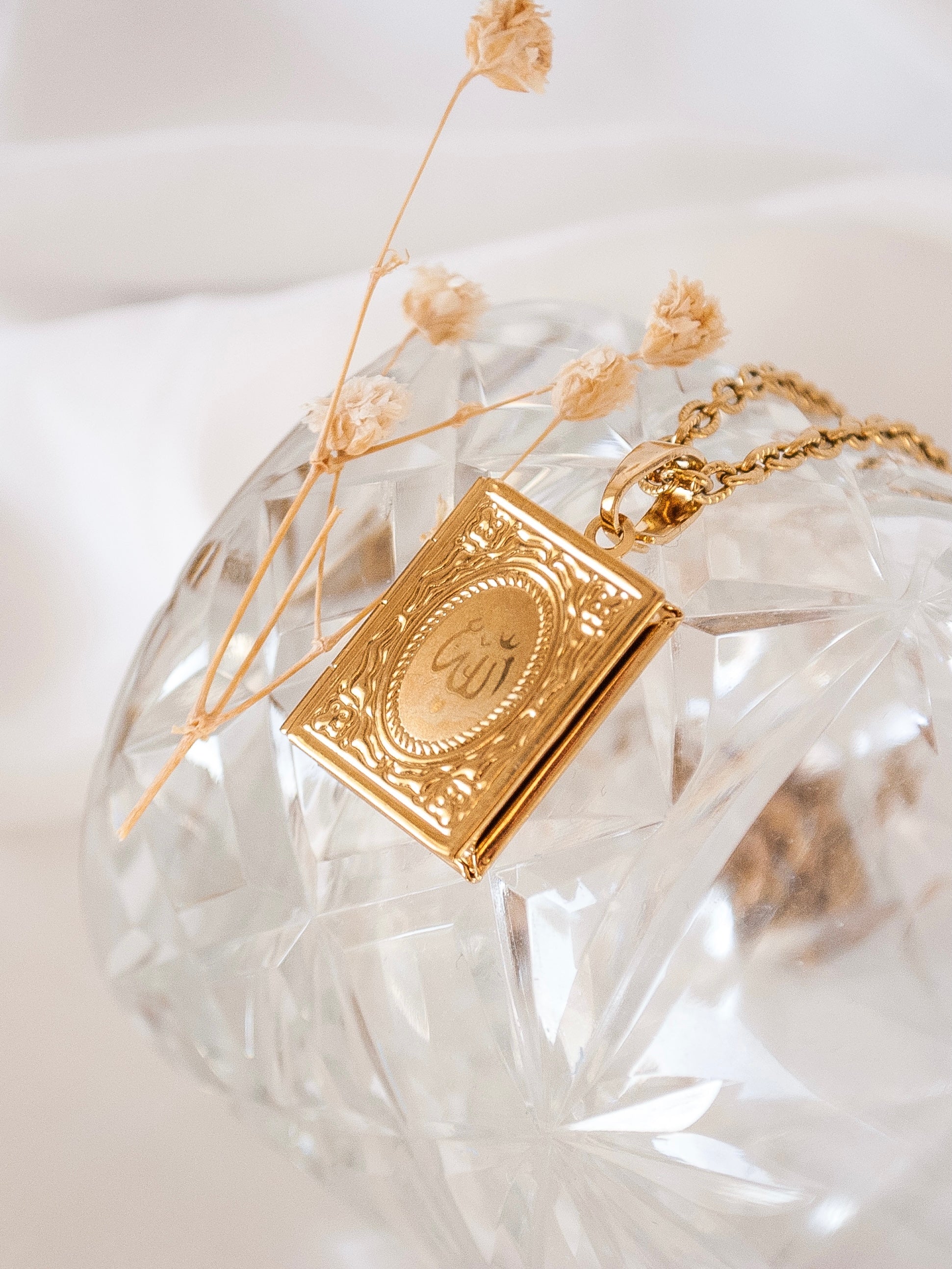 عقد بقلادة مطلية بالذهب عيار 24 قيراط بإبزيم للمشبك. على شكل القرآن ، يمكن أن يحمل المنجد ما يصل إلى صورتين أو تذكار. طول السلسلة 45 سم (18 بوصة تقريبًا). أبعاد القلادة (سم): العرض - 2 ارتفاع - 2.3