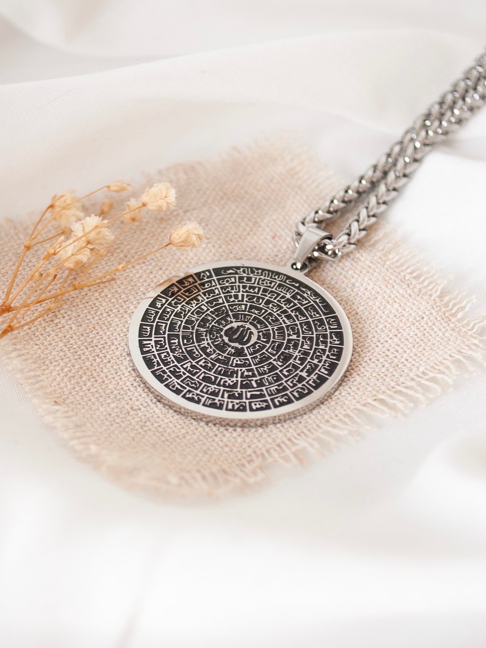 Stainless Steel (Gold or Silver) pendant inscribed with the beautiful 99 names of Allah (Swt). This helps remind Muslims of the power and magnificence of Allah (SWT).