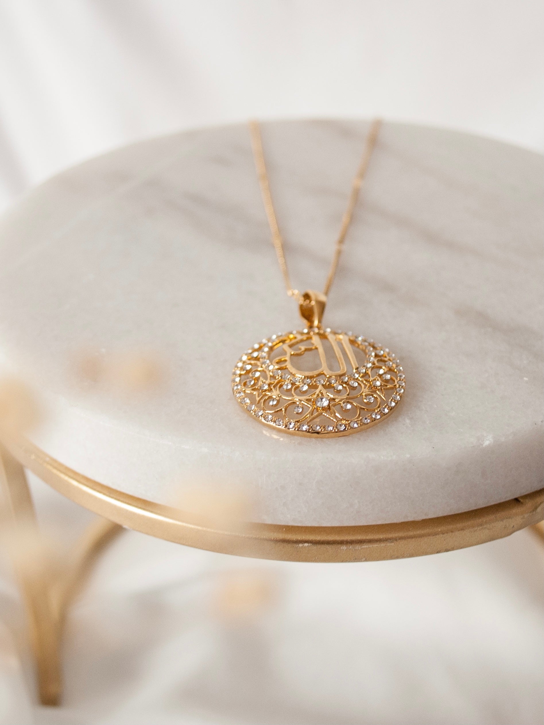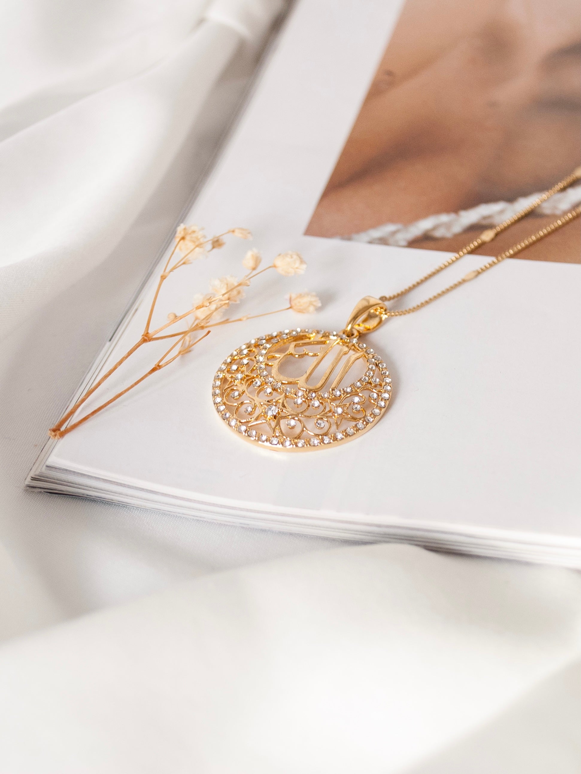 24K Gold plated necklace with cubic zirconia detail embellished with the name Allah. The length of the chain is 45cm (approximately 18"). Pendant dimension (in cm): Width - 3 Height - 3.