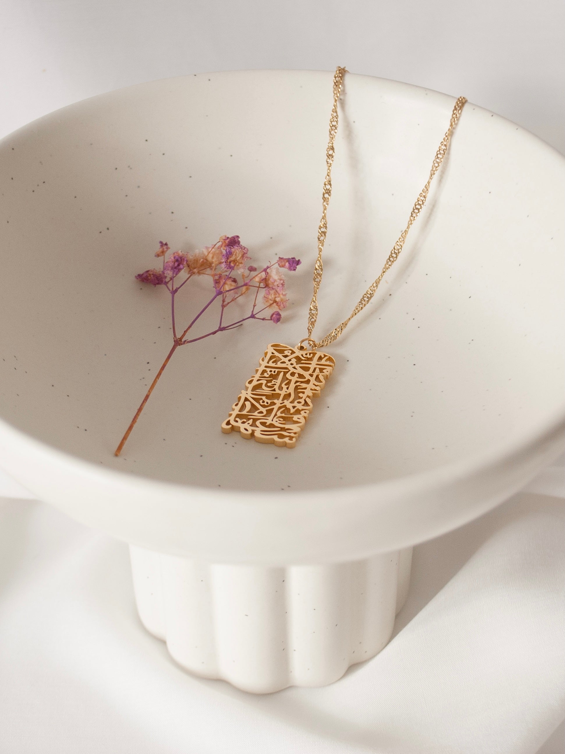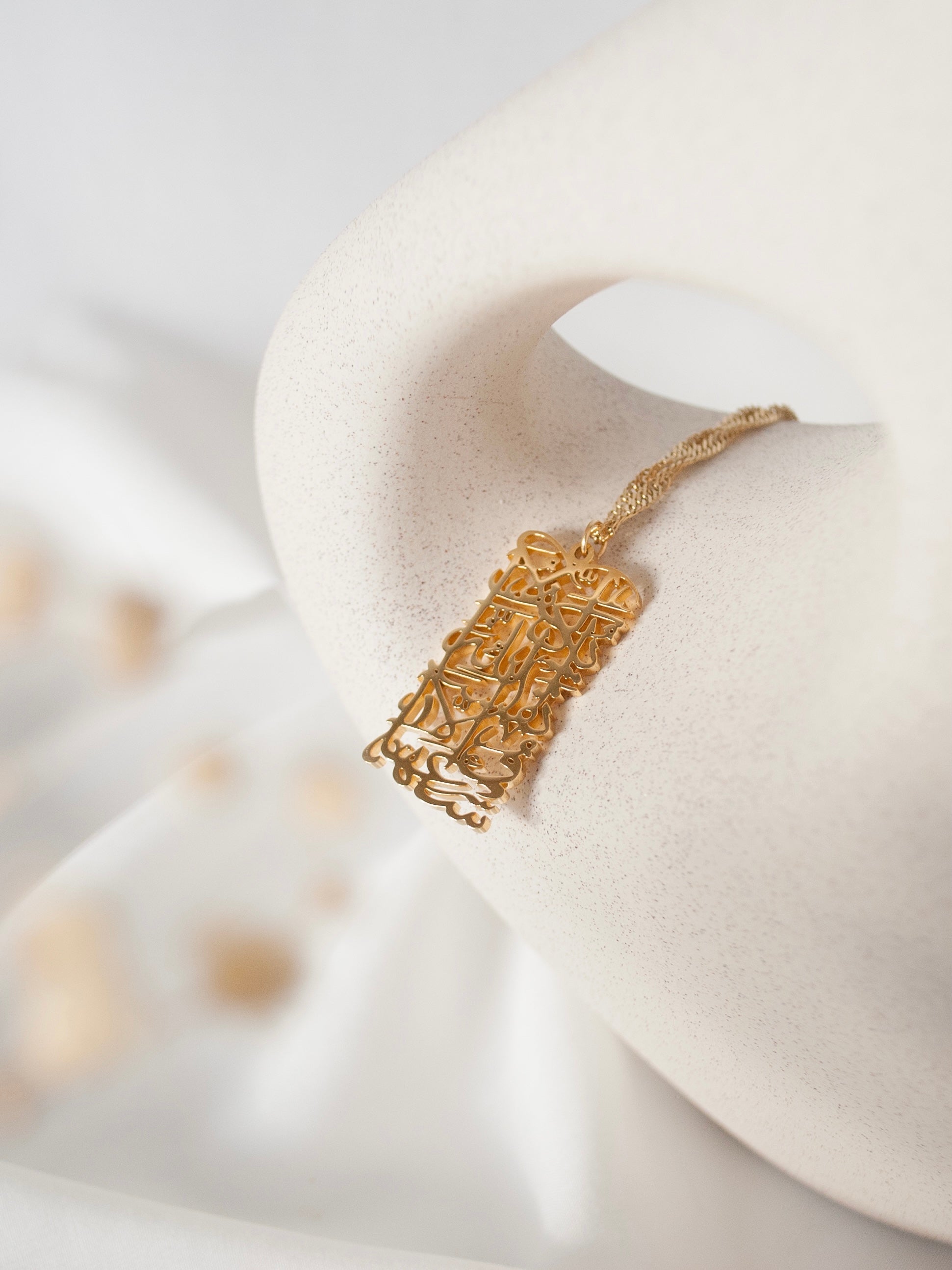 Gold colour stainless steel necklace inscribed with the arabic for “Allah does not burden a soul beyond that it can bear” (2:286). The length of the chain is 45cm (approx. 18inches). Pendant dimension (in cm): Width - 1.7 Height - 3.3.