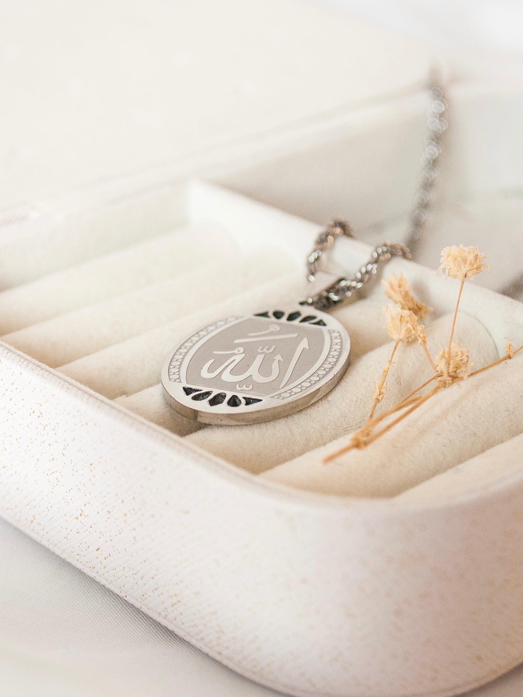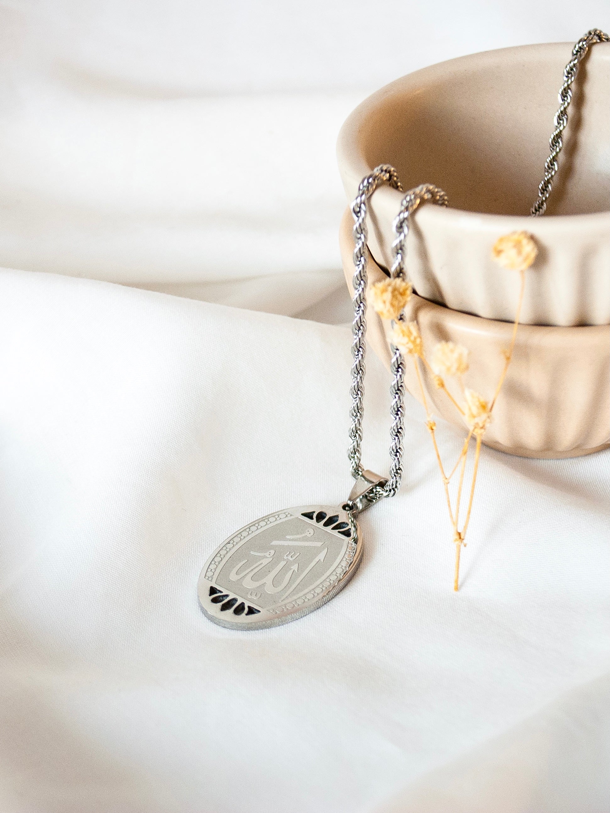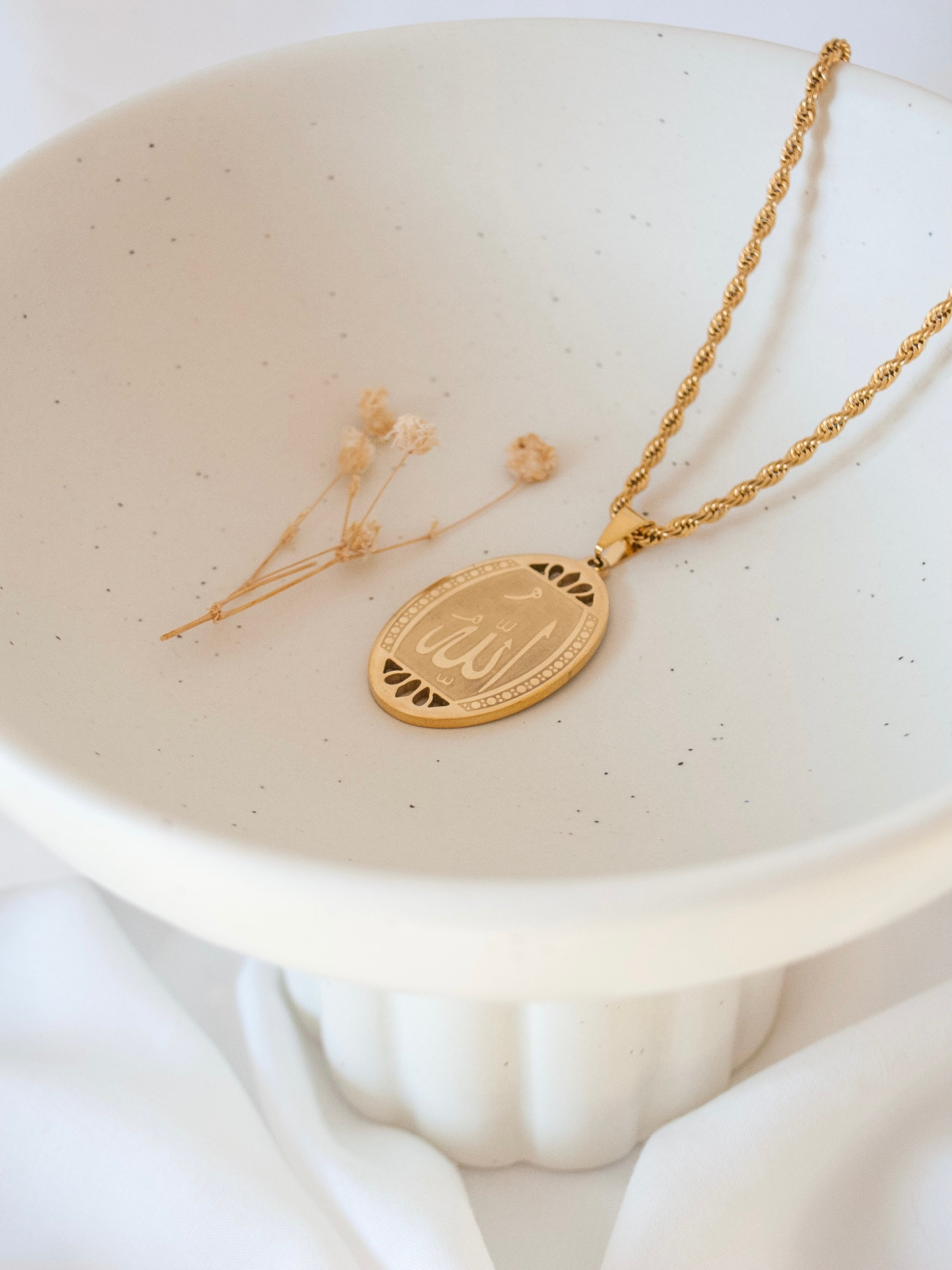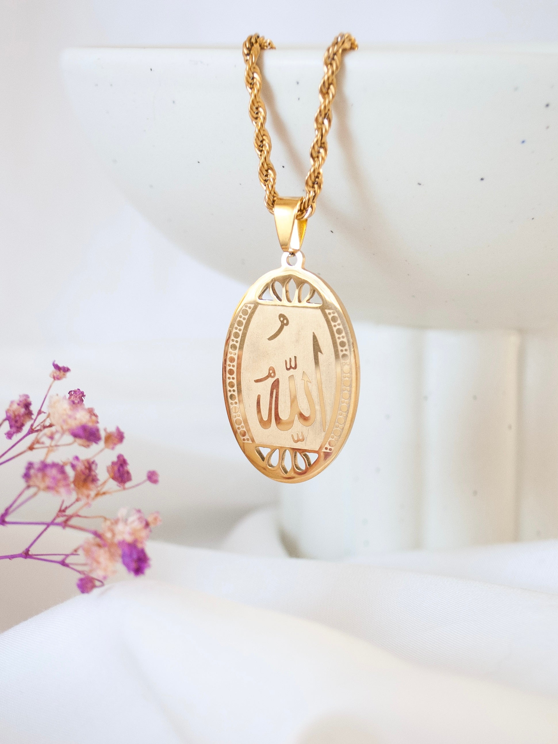 Oval Stainless Steel (Gold or Silver) Pendant inscribed with the name of Allah. The length of the chain is approximately 23.6 inches (60 cm) in length. Pendant dimension (in cm): Width - 2.5 Height - 3.5