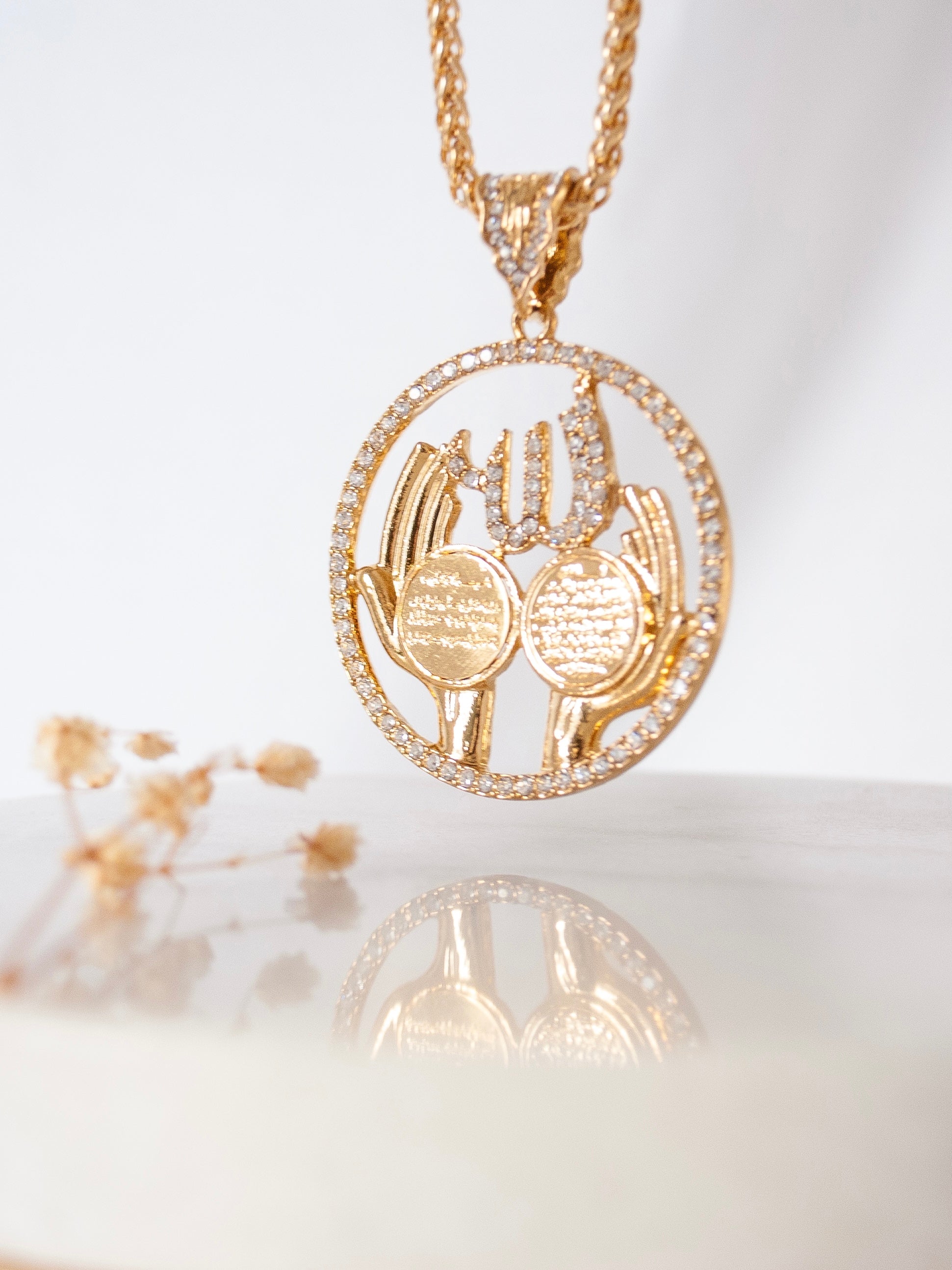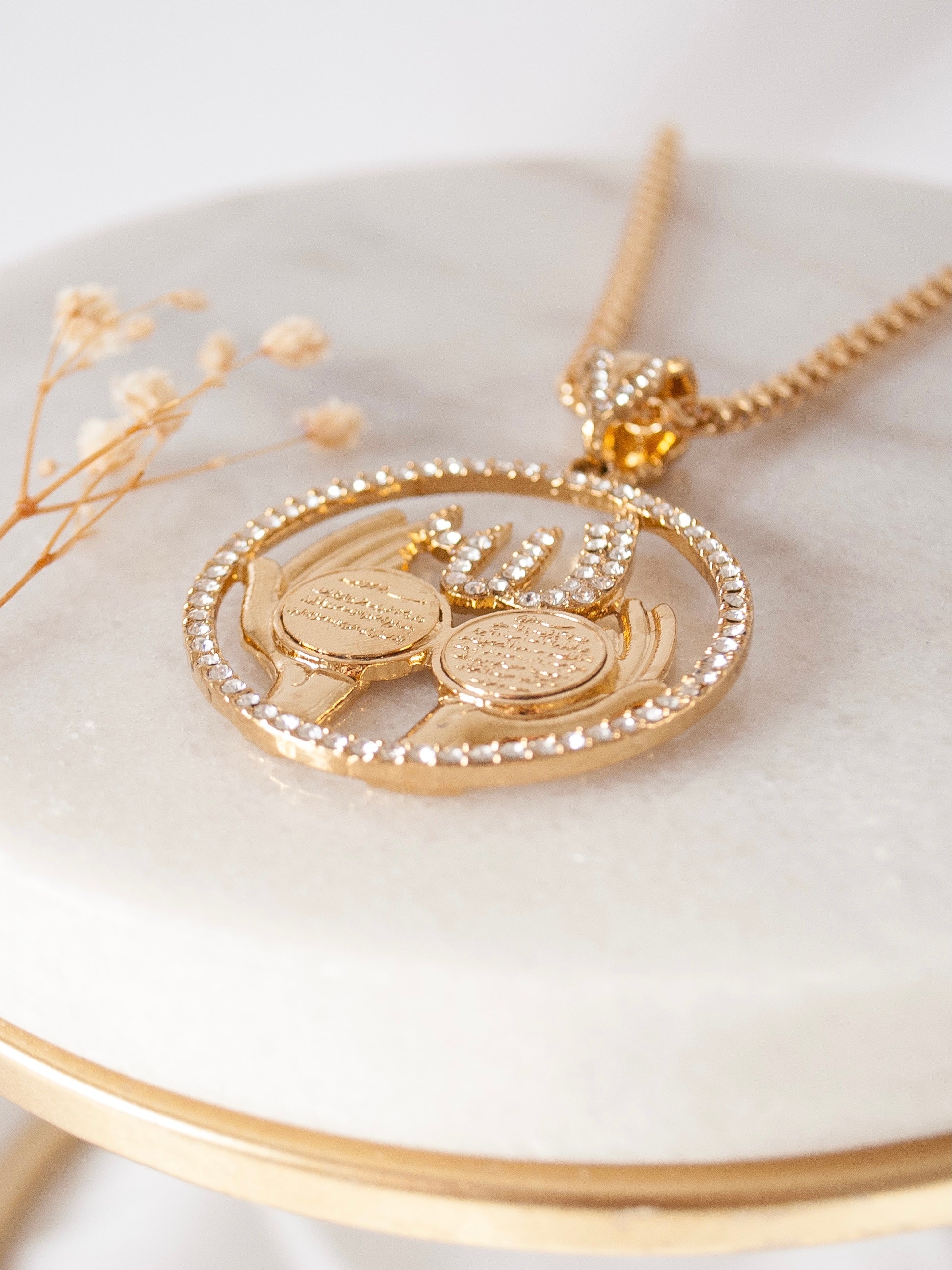 Gold tone stainless steel prayer hands pendant with Aytul Kursi inscription and cubic zirconia detailing. Chain length is 60cm (approx. 24 inches). Pendant dimension (in cm): Width - 4.3 Height - 4.3