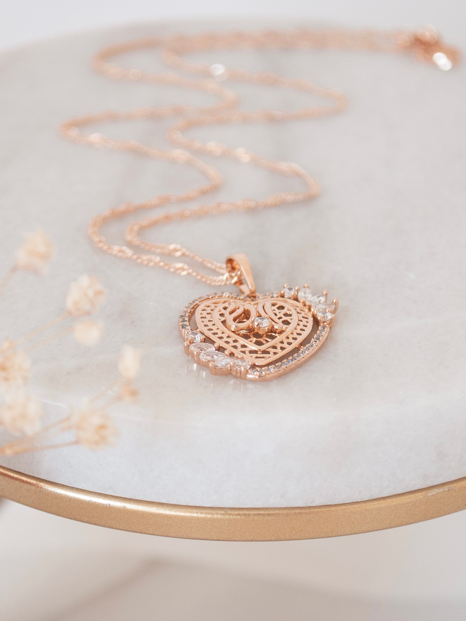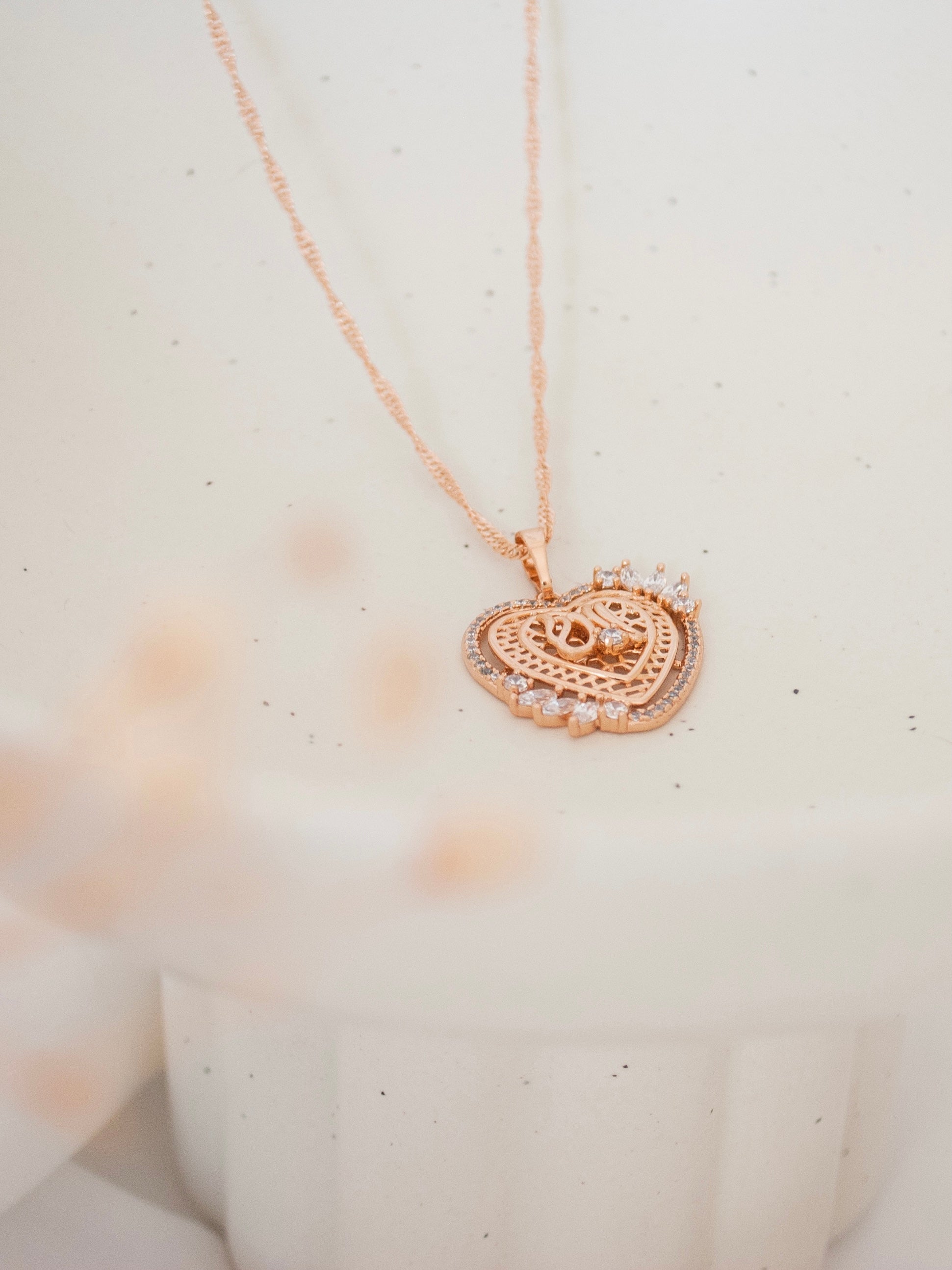 18K Gold plated heart shaped pendant and 18" (45cm) necklace with cubic zirconia detailing. Embellished with the name of Allah in Arabic. Pendant dimension (in cm): Width - 2.2 Height - 2.2.